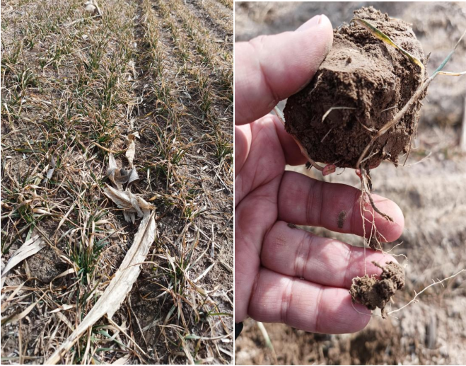 試驗結果:金·免申耕使用后的土壤明顯疏松,小麥長勢強,分蘗多,根系好。